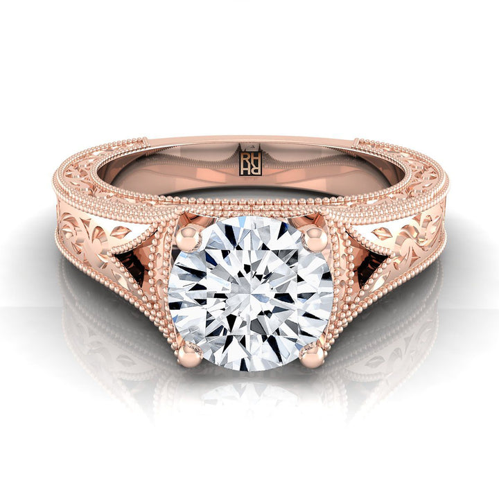ความสง่างามที่เรียบง่าย แหวนหมั้นเพชรรูปทรงกลมเจียระไนแบบ Brilliant นี้ในทองกุหลาบ 14k โชว์การออกแบบสลักที่ได้รับแรงบันดาลใจจากโบราณพร้อมการตกแต่งขอบแบบมิลเกรนคลาสสิก