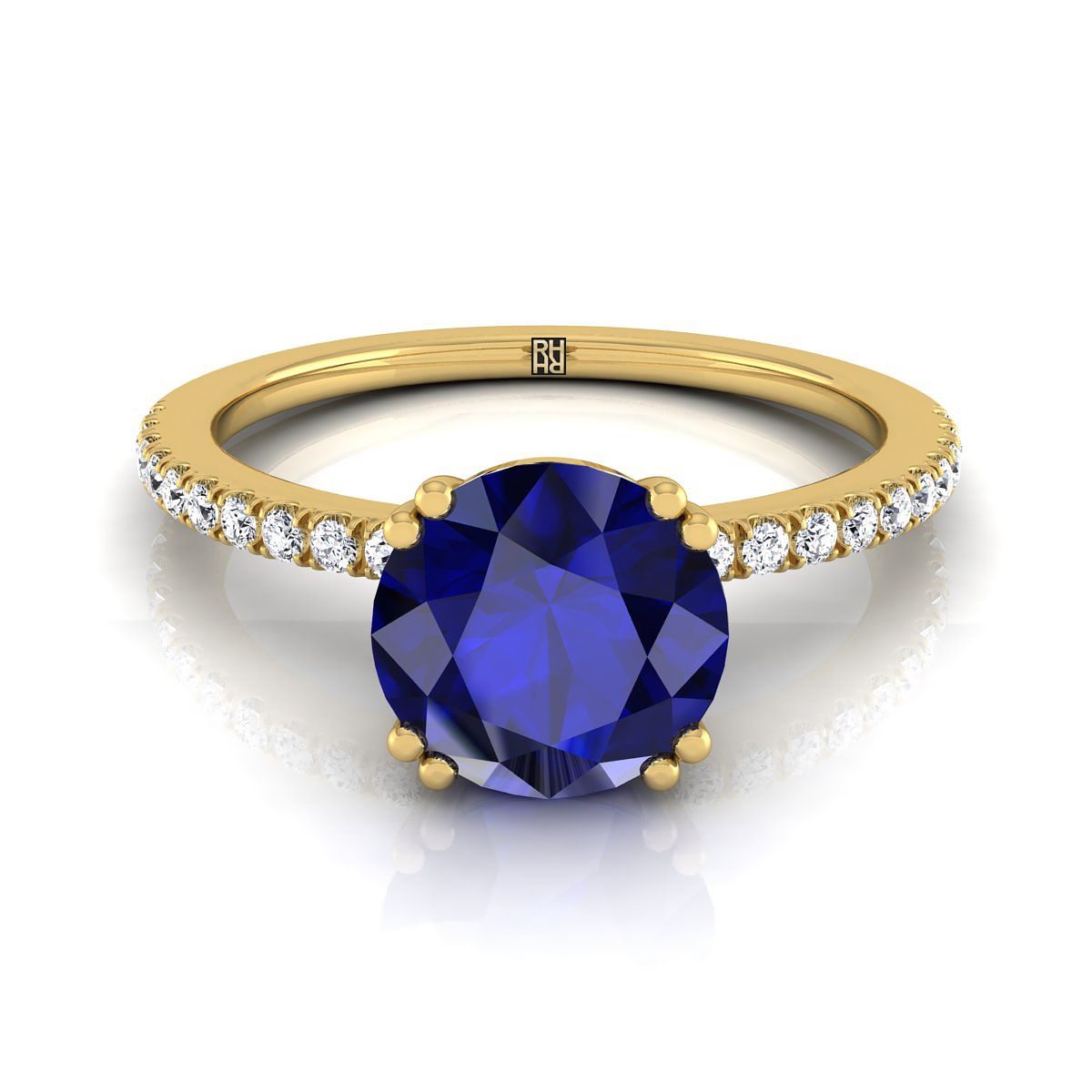 แหวนหมั้นทองคำเหลือง 18k พร้อมเพชรทรงกลมเจียระไนแบบ Brilliant จำนวน 22 เม็ด น้ำหนักรวม 0.16 กะรัต และไพลินทรงกลมขนาด 7 มม. 1 เม็ด