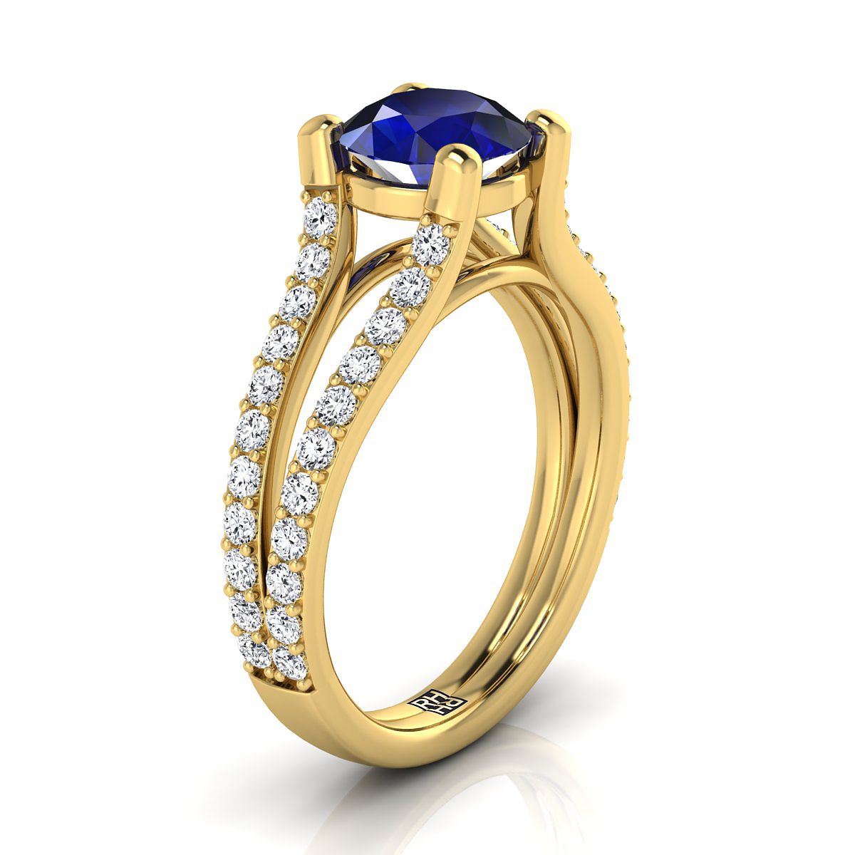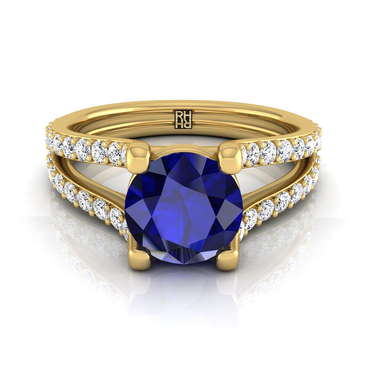 แหวนหมั้นประดับแซฟไฟร์ทรงกลมเจียระไนแบบ Brilliant ติดตั้งด้วยหนามเตยทองคำเหลือง 14K แบบแยกชั้น