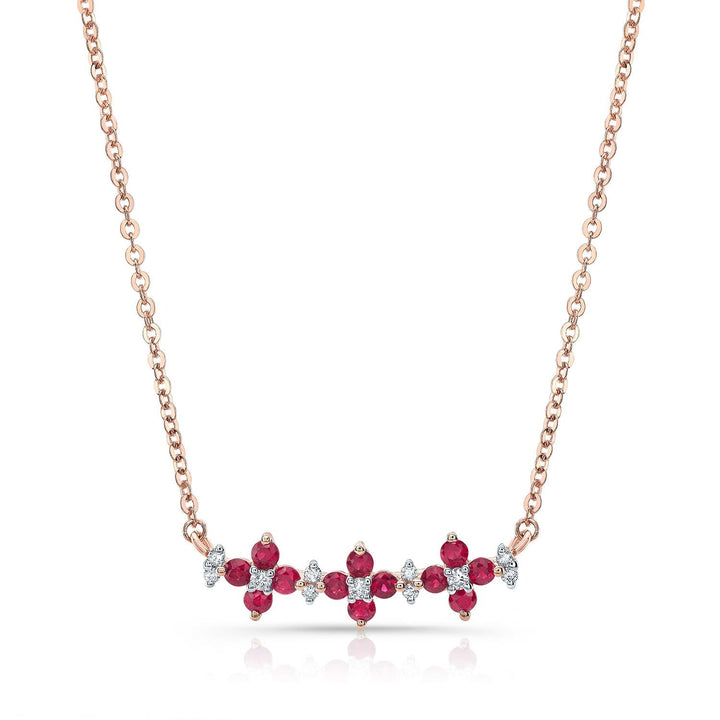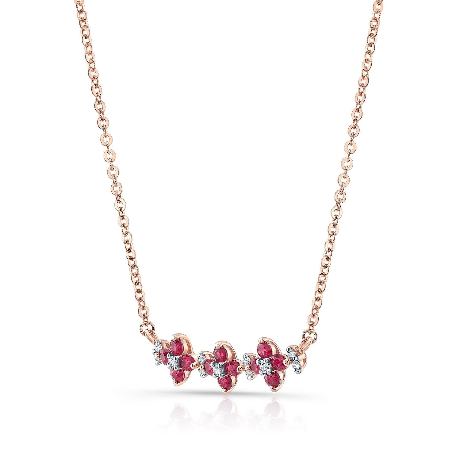 Ruby And Diamond Triple Floral Necklace In 14k Rose Gold