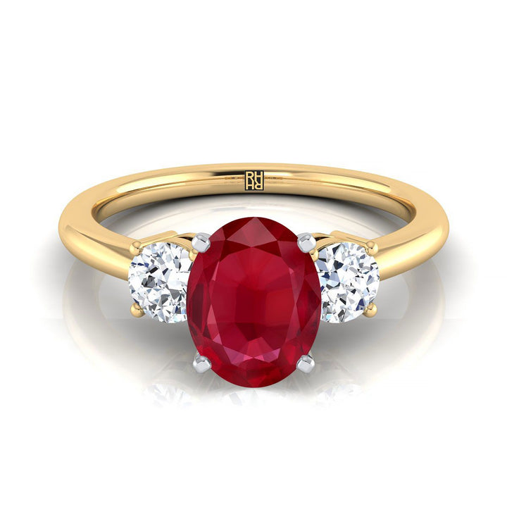 แหวนหมั้นเพชรสามเม็ดทรงกลมที่เข้าคู่กันอย่างสมบูรณ์แบบ ประกอบด้วยทับทิมรูปไข่ทองคำเหลือง 14K - 1/4ctw
