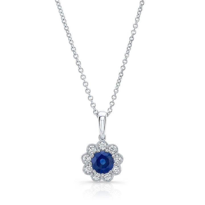 Sapphire And Diamond Floral Pendant With Millgrained Edging And Tapered Bail In 14k White Gold (6mm)