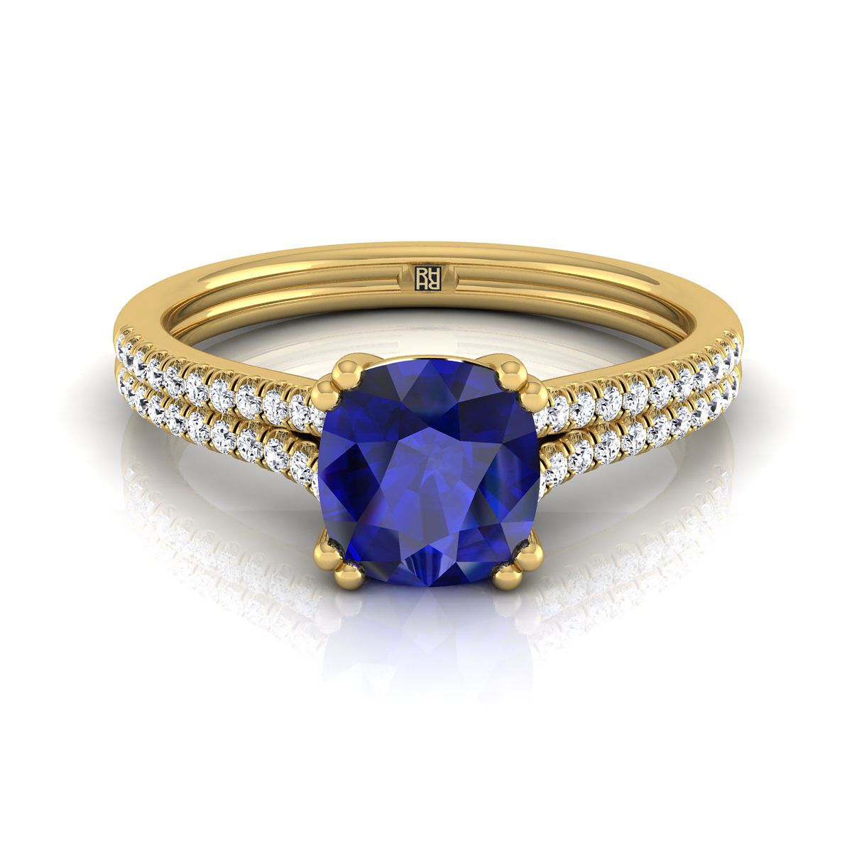 แหวนหมั้นเพชรฝรั่งเศสแบบฝังเพชรสองแถวสองกรงเล็บ ทองคำเหลือง 14K ทรงหมอนประดับแซฟไฟร์ -1/6ctw