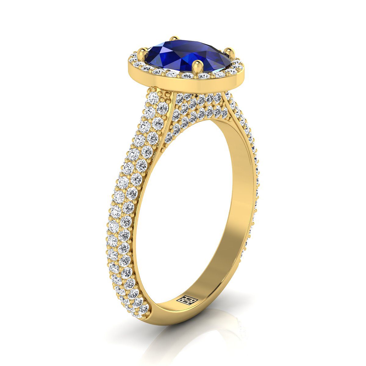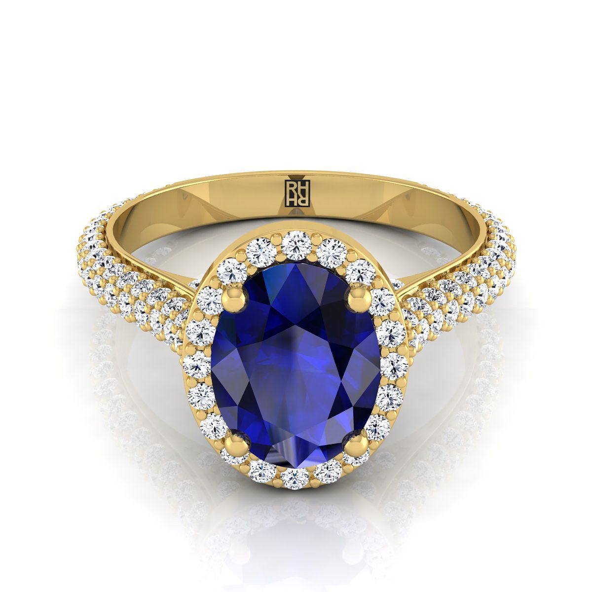แหวนหมั้นทองคำเหลือง 14K รูปไข่ประดับแซฟไฟร์ไมโครปาเว่ พร้อมฮาโลและเพชรข้างแบบปาเว่ - 7/8 กะรัตรวม