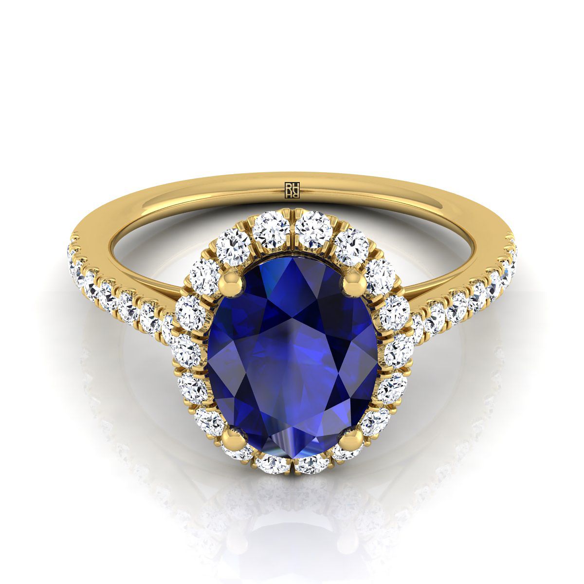 แหวนหมั้นเพชรฝรั่งเศสแบบปาเว่รูปวงรีประดับแซฟไฟร์ขนาดเล็กทองคำเหลือง 18K น้ำหนักรวม 3/8 กะรัต