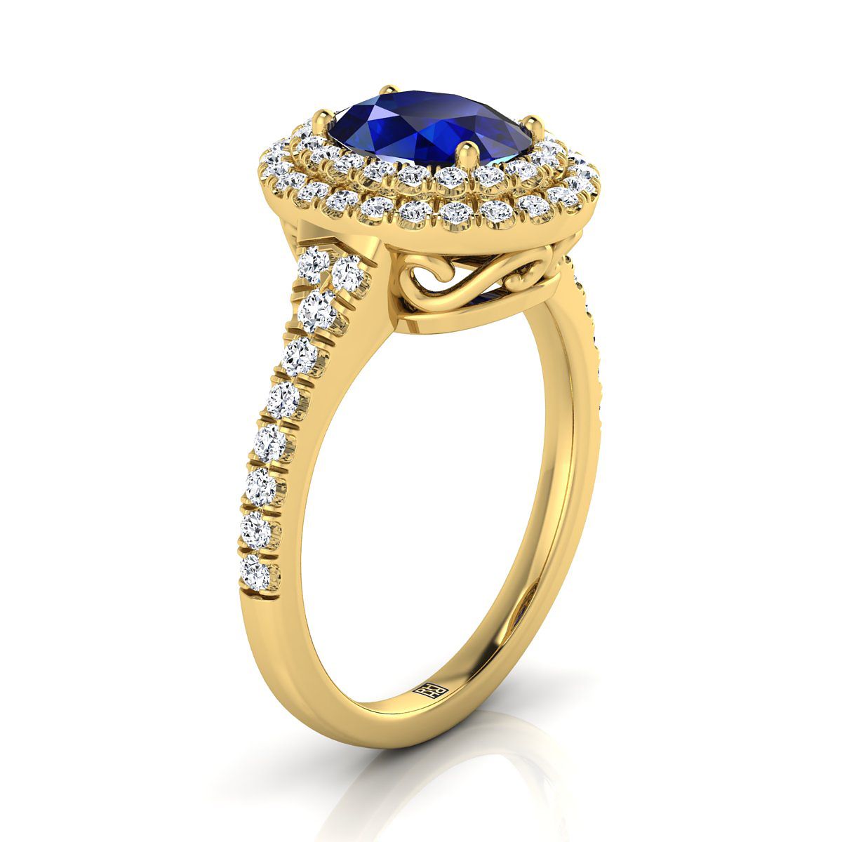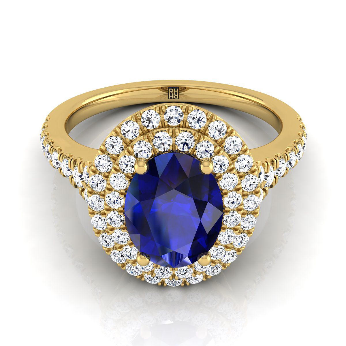แหวนหมั้นทองคำเหลือง 14K รูปไข่ประดับแซฟไฟร์ พร้อมวงแหวนคู่แบบฮาโล่และเพชรปาเว่ขอบหยัก - 1/2ctw