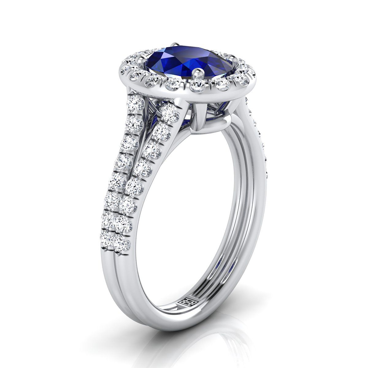 แหวนหมั้นทองคำขาว 18K รูปไข่ประดับแซฟไฟร์ ฝรั่งเศสแบบปาเว่ ดีไซน์แยกช้าง ประดับเพชรฮาโล - 5/8ctw