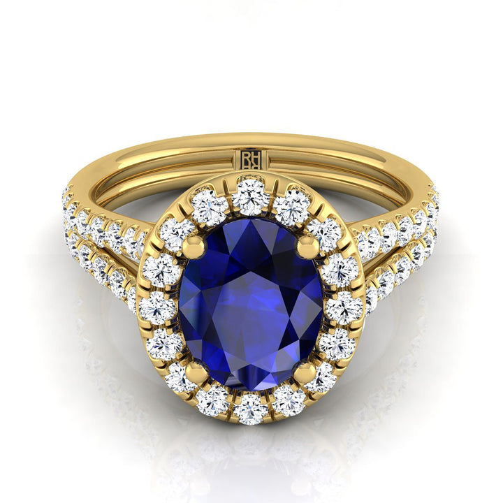 แหวนหมั้นทองคำเหลือง 18K รูปไข่ประดับแซฟไฟร์ ฝรั่งเศสแบบปาเว่ แยกชั้น ประดับเพชรฮาโล - 5/8ctw