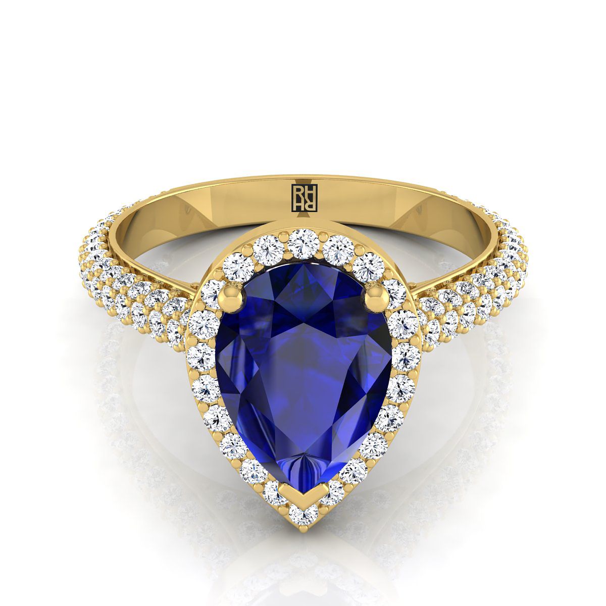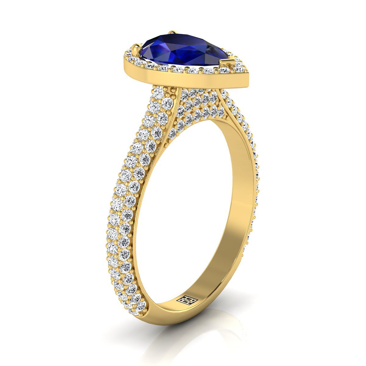 แหวนหมั้นประดับไพลินทรงลูกแพร์กลางทองคำเหลือง 18K พร้อมไมโครปาเว่และเพชรข้างแบบปาเว่ - 7/8 กะรัตรวม