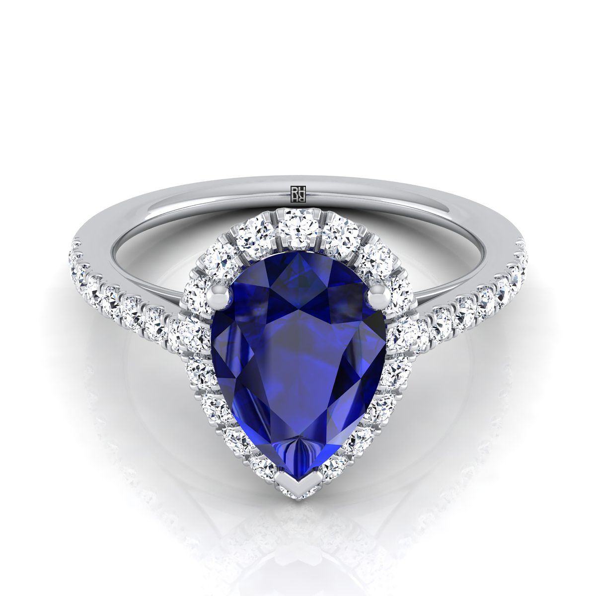 แหวนหมั้นเพชรฝรั่งเศสแบบพาเว่ทรงลูกแพร์กลางไพลินขนาดเล็ก 14K ทองคำขาว - 3/8ctw