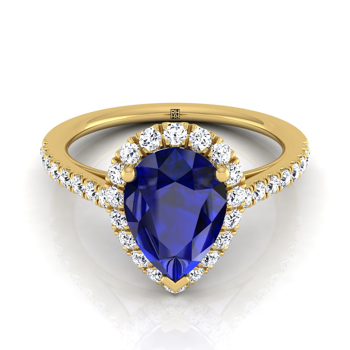แหวนหมั้นเพชรฝรั่งเศสแบบพาเว่กลางไพลินทรงลูกแพร์ขนาดเล็กทองคำเหลือง 14K น้ำหนักรวม 3/8 กะรัต