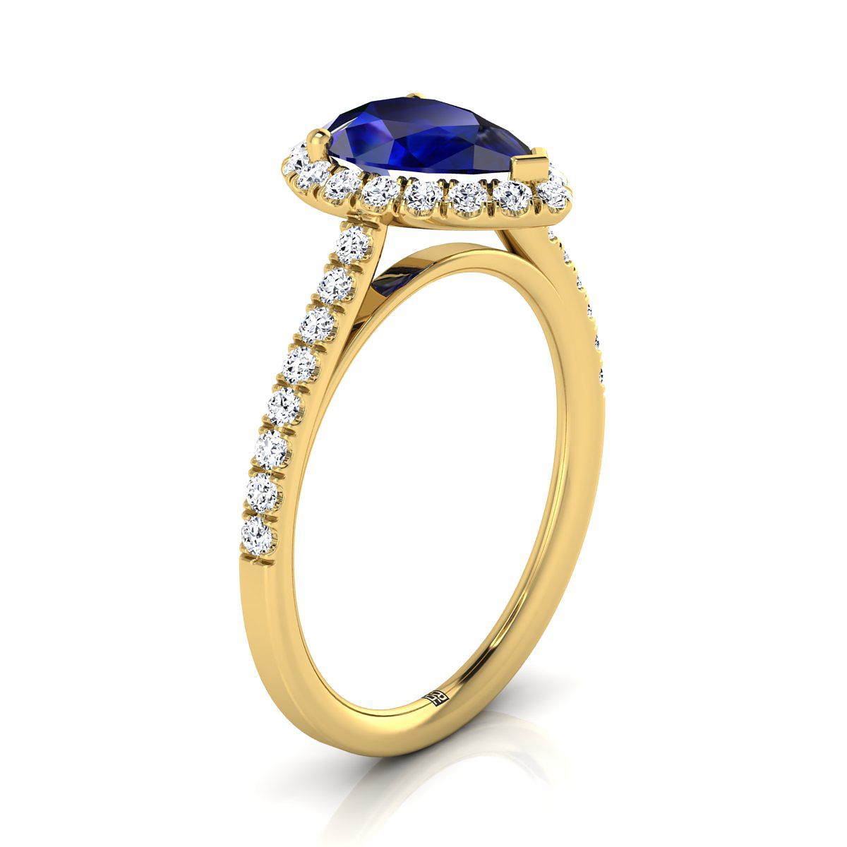 แหวนหมั้นประดับไพลินทรงลูกแพร์กลางทองคำเหลือง 18K พร้อมฮาโลขนาดเล็กและเพชรฝรั่งเศสแบบปาเว่ - 3/8 กะรัตรวม