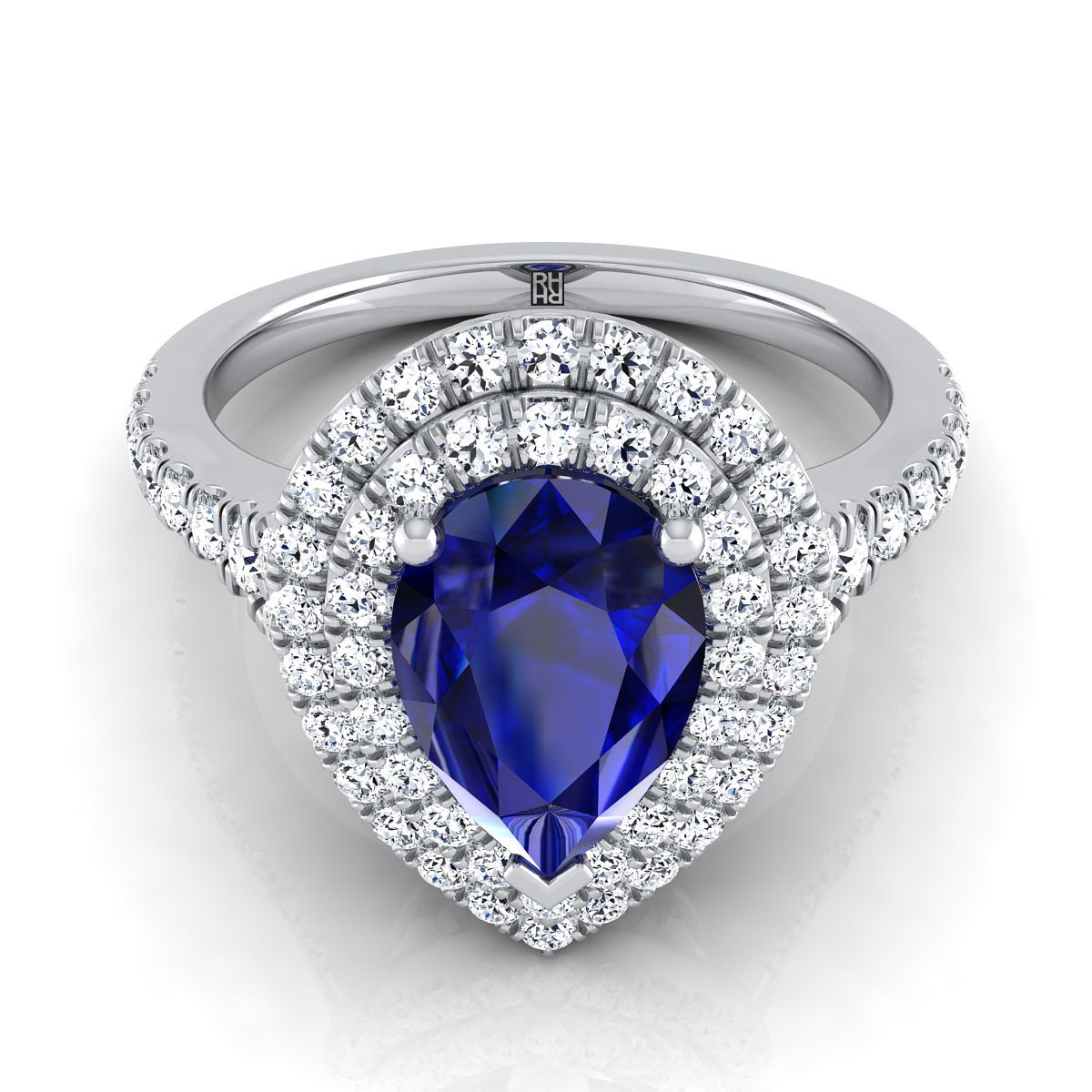 แหวนหมั้นพลอยไพลินทรงลูกแพร์กลางแบบแพลตตินัม พร้อมวงแหวนเพชรแบบดับเบิลฮาโลและขอบลายคลื่นประดับเพชรปาเว่ - 1/2ctw