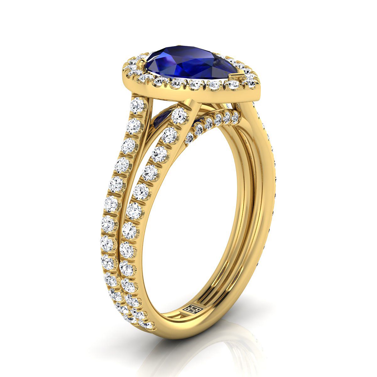 แหวนหมั้นทองคำเหลือง 14K รูปทรงลูกแพร์ ประดับแซฟไฟร์ตรงกลาง พร้อมฮาโลสองแถวเพชรปาเว่ และช่างแยก