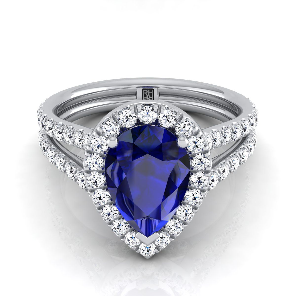 แหวนหมั้นทองคำขาว 18K รูปทรงลูกแพร์ ประดับแซฟไฟร์ตรงกลาง พร้อมฮาโลสองแถวเพชรปาเว่ และช่างแยก