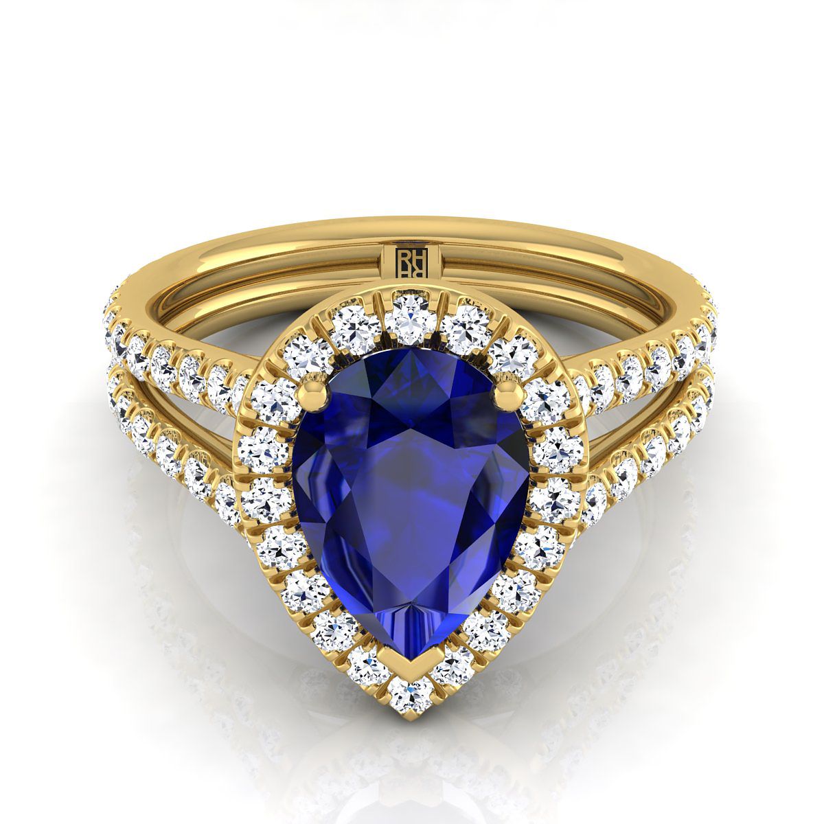 แหวนหมั้นทองคำเหลือง 18K รูปทรงลูกแพร์ ประดับแซฟไฟร์ตรงกลาง พร้อมฮาโลสองแถวเพชรปาเว่ และชั้งค์แยก - 7/8ctw