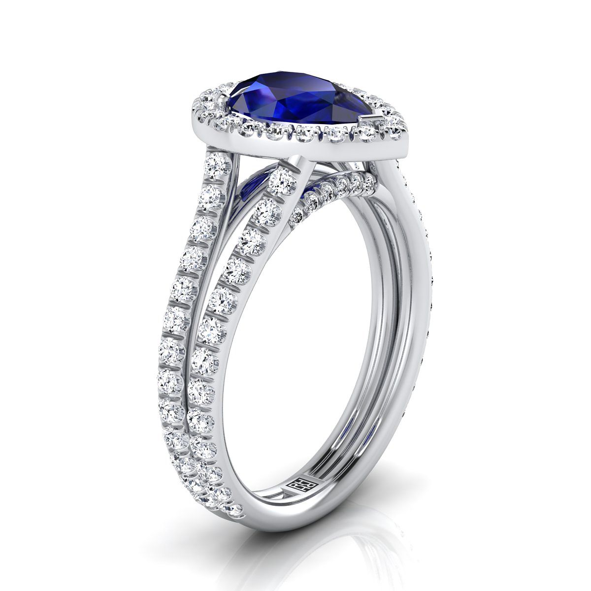แหวนหมั้นพลาตินัมรูปทรงลูกแพร์ประดับไพลินกลางล้อมด้วยเพชรแบบฮาโลสองแถวและช่างแยก