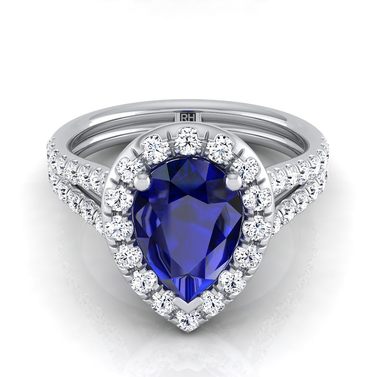 แหวนหมั้นเพชรฮาโลแบบแยกชั้นฝรั่งเศสประดับไพลินทรงลูกแพร์กลางแพลทินัม - 5/8 กะรัตรวม