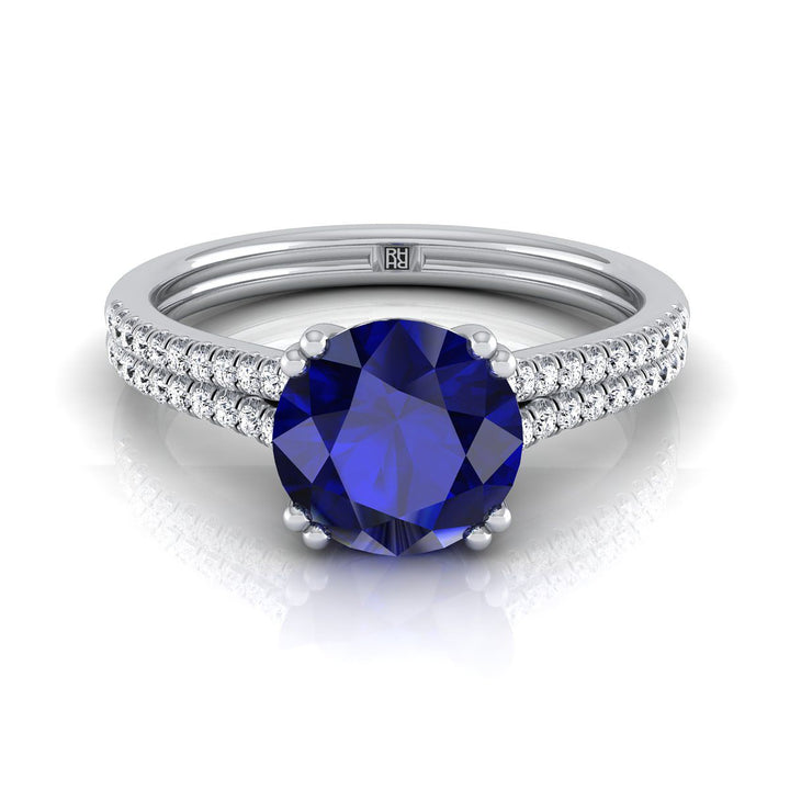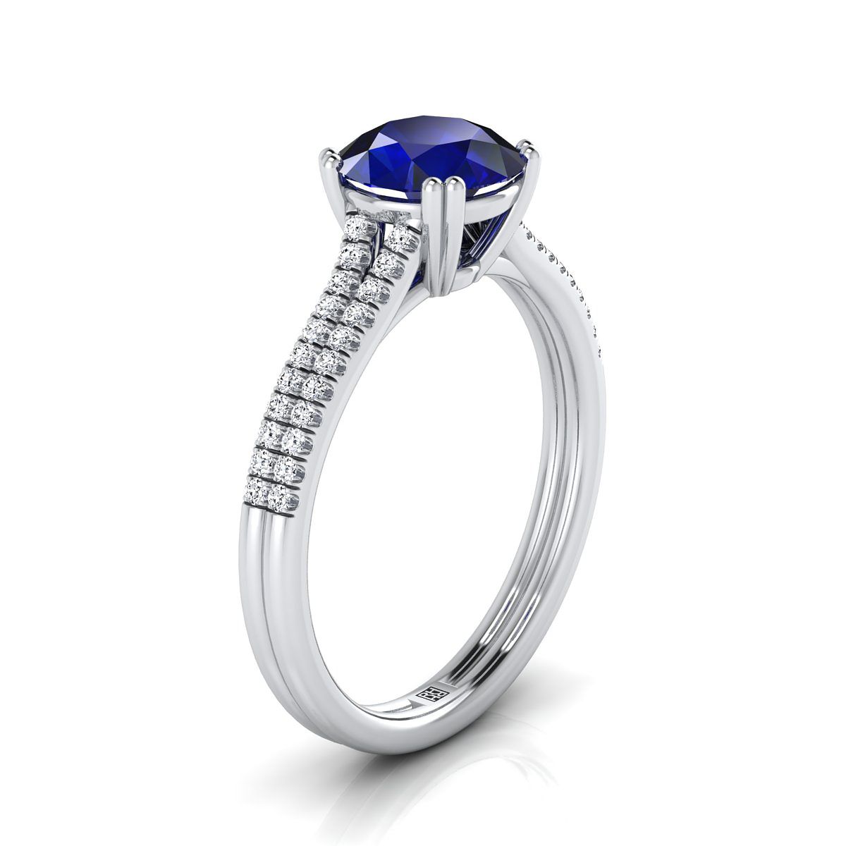 แหวนหมั้นเพชรฝรั่งเศสแบบฝังเพชรสองแถวสองกรงเล็บ ทองคำขาว 18K ประดับแซฟไฟร์ทรงกลมเจียระไนแบบบริลเลียนต์