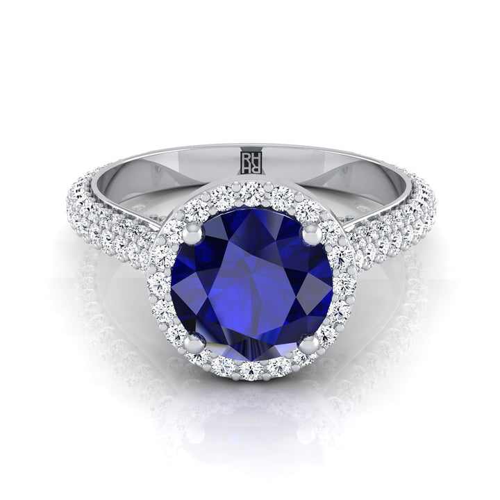 แหวนหมั้นพลอยไพลินทรงกลมเจียระไนแบบ Brilliant ประดับไมโครปาเว่แบบฮาโล่พร้อมเพชรข้างแบบปาเว่ - 7/8ctw