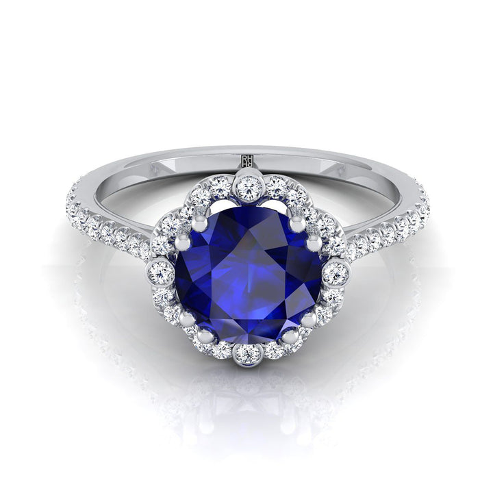 แหวนหมั้นดีไซน์วินเทจประดับไพลินทรงกลมเจียระไนแบบ Brilliant ประดับเพชรล้อมแบบ Halo น้ำหนักรวม 1/4 กะรัต