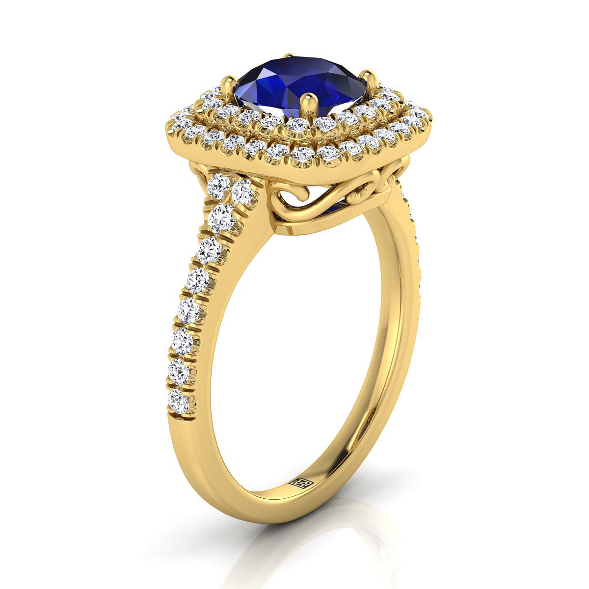 แหวนหมั้นประดับไพลินทรงกลมเจียระไนแบบ Brilliant สีทองเหลือง 14K พร้อมวงแหวนคู่แบบ Halo และเพชร Pavé ขอบหยัก - 1/2ctw