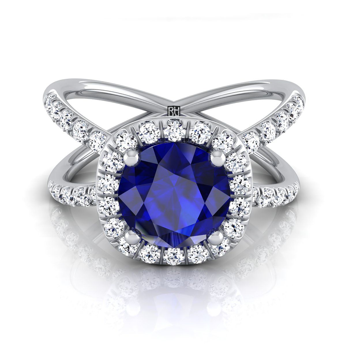 แหวนหมั้นเพชรฝรั่งเศสแบบไขว้เปิดประดับแซฟไฟร์ทรงกลมเจียระไนแบบบริลเลียนต์สีขาวทอง 14K - 1/2ctw