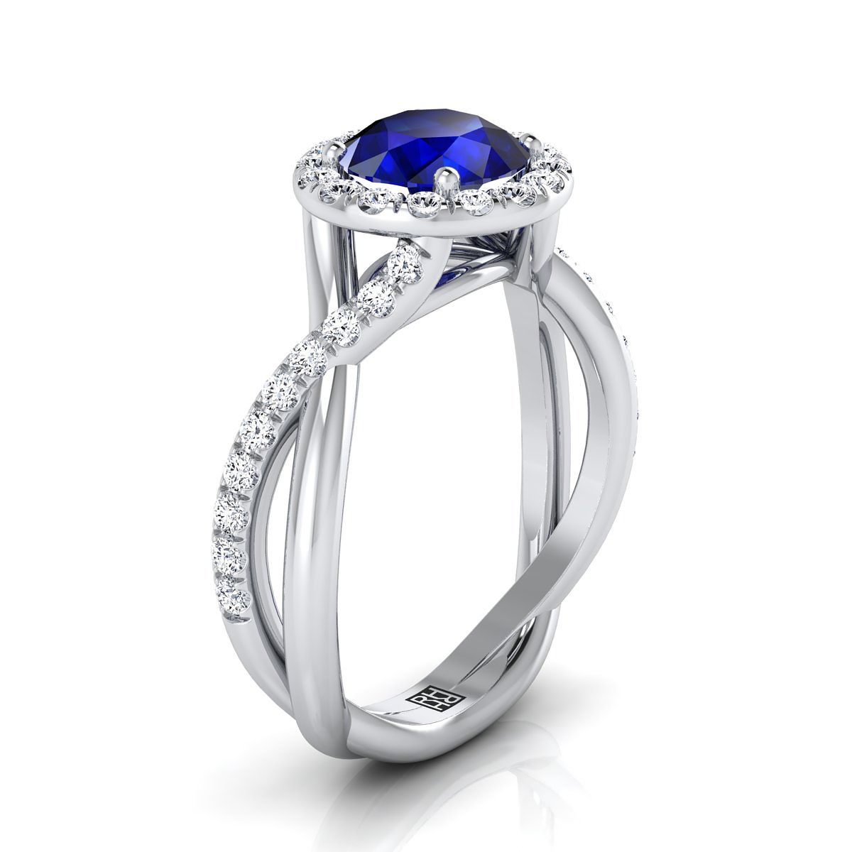 แหวนหมั้นทองคำขาว 14K ประดับไพลินทรงกลมเจียระไนแบบ Brilliant พร้อมล้อมเพชรดีไซน์เถาวัลย์บิด - 1/2ctw